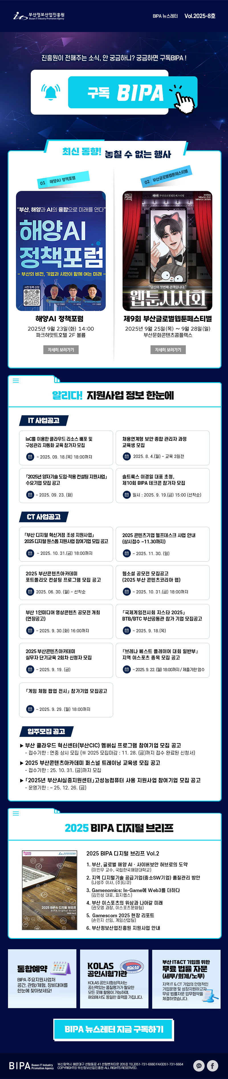 뉴스레터 BIPA뉴스레터 2024 BIPA뉴스레터 2023 BIPA뉴스레터 검색구분 ▽ BIPA 뉴스레터 선택 ▽ BIPA 뉴스레터 Vol.2025년 08호 BIPA 뉴스레터 Vol.2025년 07호 BIPA 뉴스레터 Vol.2025년 06호 BIPA 뉴스레터 Vol.2025년 05호 BIPA 뉴스레터 Vol.2025년 04호 BIPA 뉴스레터 Vol.2025년 03호 BIPA 뉴스레터 Vol.2025년 02호 BIPA 뉴스레터 Vol.2025년 01호
